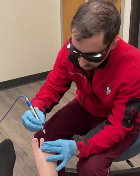 Diowave Laser Therapy offers a cutting-edge, non-invasive solution for treating foot and ankle conditions such as plantar fasciitis, Achilles tendinitis, neuropathy, and arthritis. DIOWAVE laser therapy uses photons of laser light to penetrate the skin and undelrying tissue. It is absorbed the be cells. It triggers a cascade of celuler events that assist with stimulating body’s natural healing response. This therapy is safe, FDA-cleared, and particularly effective for chronic and acute musculoskeletal issues.